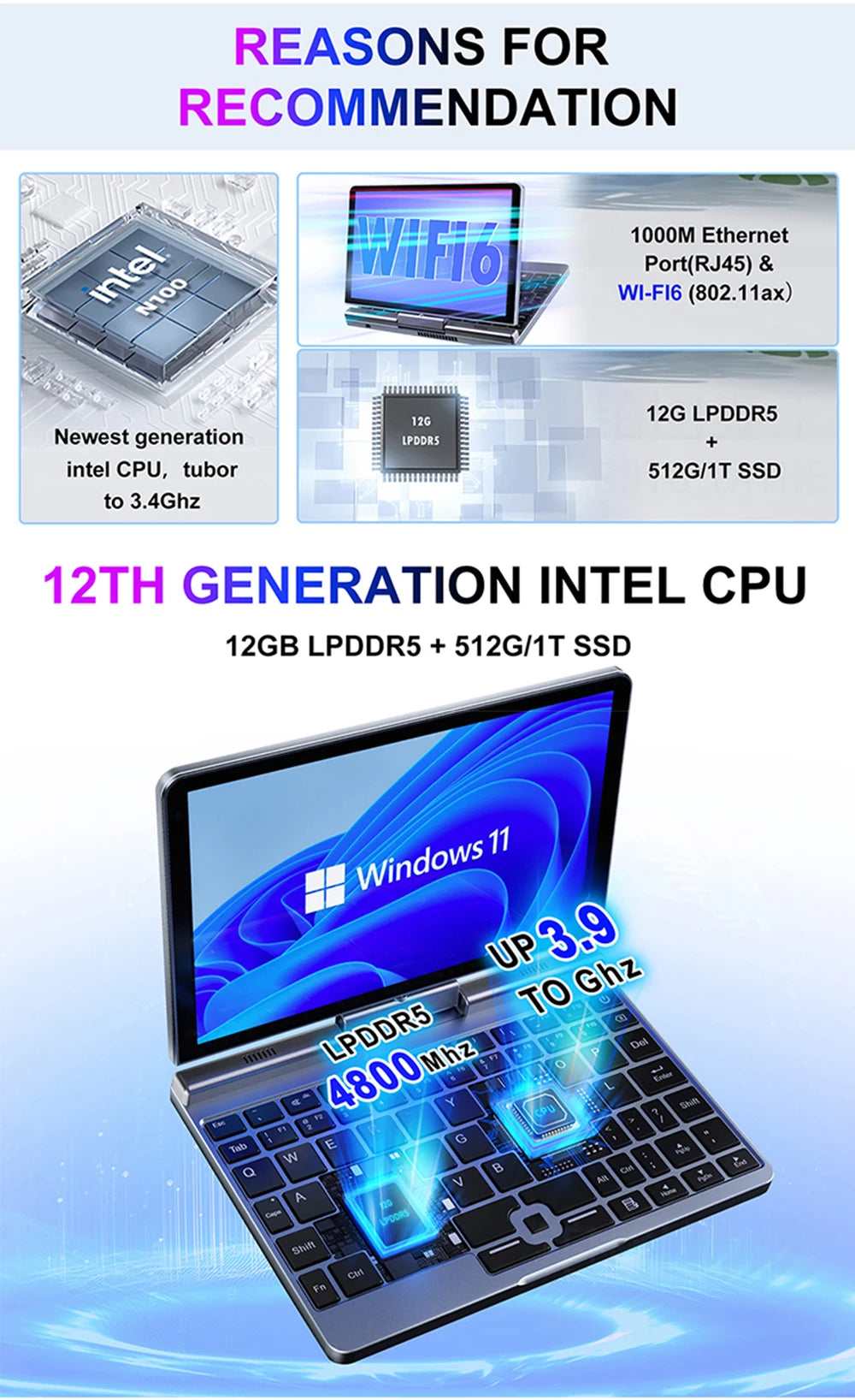 CPU:Intel Alder Lake N150,4 Cores, 4 Threads,6M Cache,up to 3.60GHz frequency.6MB cache