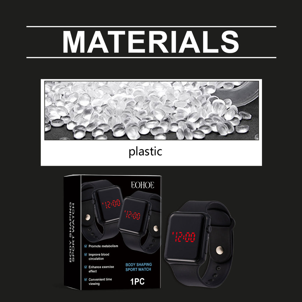 Our body-shaping sports watches contain plastic, silicone. It can boost metabolism and fat burning, improve exercise results, and make it easy for you to have a slim and toned body. The way to use it is simple: simply wear the product directly on your wrist. And you can easily check the time, keep track of progress at any time, and maintain efficient exercise.