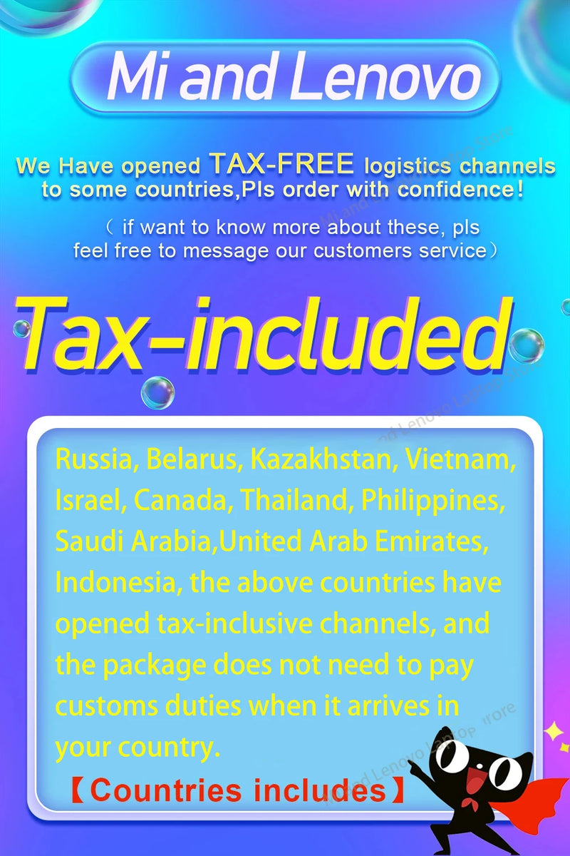 Some EU Countries,Russia, Belarus, Kazakhstan, Vietnam, Israel, Canada, Thailand, Philippines, Saudi Arabia,United Arab Emirates, Indonesia,Australia. the above countries have opened tax-inclusive channels, and the package does not need to pay customs duties when it arrives in your country. If you are interested, you can contact us at any time! pls buy from us with confidence!---Aliexpress Mi and Lenovo Laptop Store