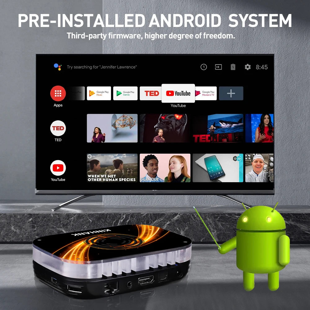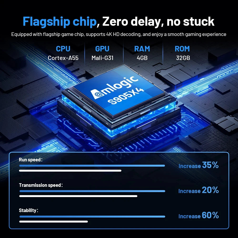 Android TV box powered by S905X3 Quad core cortex-A55 Ultra high frequence CPU, which ensure the android box running stable and smooth for loading movies, pictures and games without buffer.