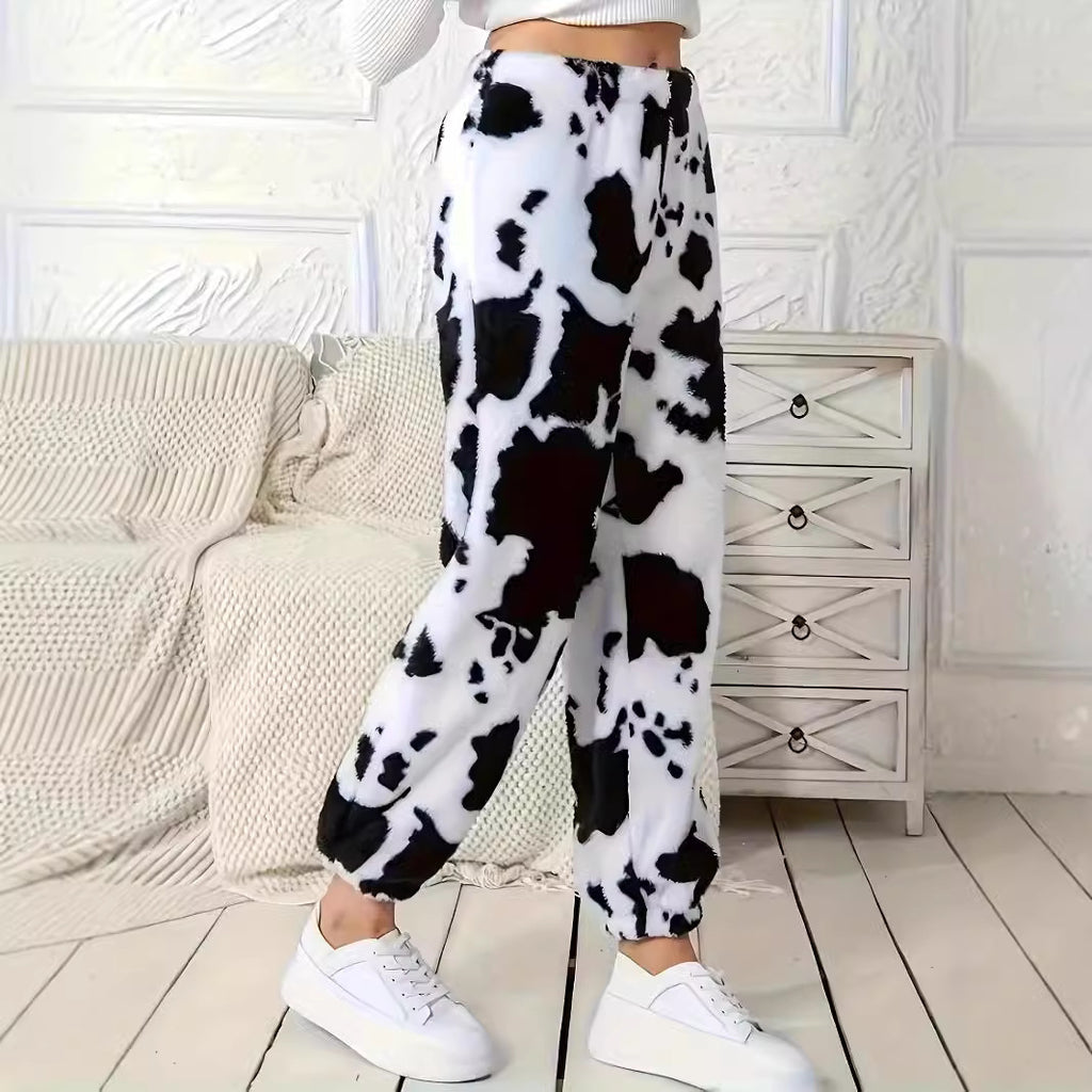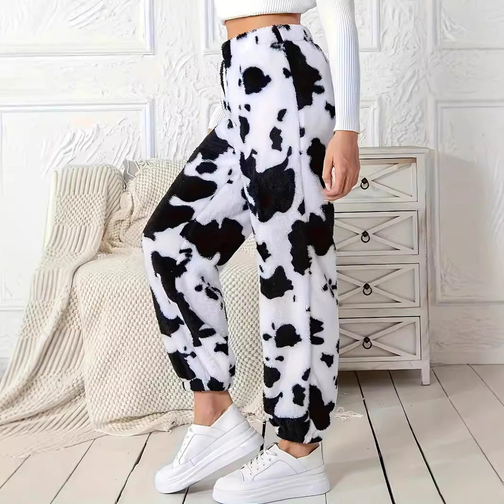Product information: Color: White Elasticity: Micro elasticity Pants length: trousers Waist type: high waist Size: 1XL,2XL,3XL,4XL,5XL Style type: street fashion Popular elements: cow pattern Style: Basic Thickness: thick Fabric name: Woolen Main fabric composition: Polyester (polyester fiber) Gender: Female Pants type: loose type Craft: collage/stitching